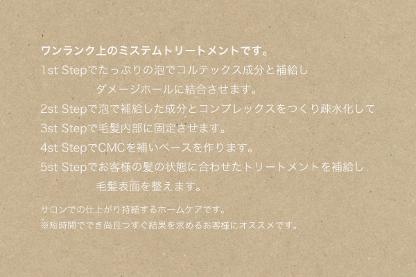 前処理時にナノスチームをあわせてトリートメントを浸透させてからパーマの施術するので、パーマではしっとりと潤いのあるパーマの仕上がり、カラーは髪に対してのダメージが少なくキレイなカラーの仕上がりになります。